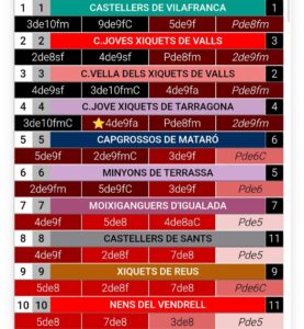 La Colla de l’Alt Maresme i la Selva Marítima ha estrenat els castells de 7 amb l’agulla (3de7a i 4de7a) i s’ha posat a la par dels de Badalona. La Colla de Figueres han posat de millor sostre el 5de7, aquest va ser també el millor sostre del curs passat.