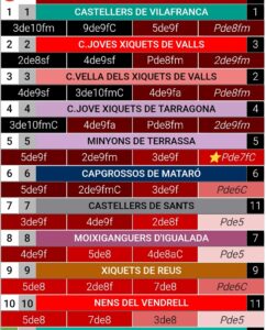Els Castellers del Poble Sec han sumat el 4de7 amb l’agulla mentre que els Castellers de Caldes han fet una doble estrena: el 5de7 (el seu sostre del curs passat) i han coronat el 3de7 amb l’agulla. Finalment els Castellers de Sant Feliu han recuperat el 4de7, un castell que no feien des del 2018. Els magentes tanquen el llistat de 58 colles amb castell de 7 pisos en amunt.