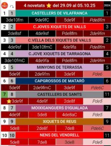 Per últim els Castellers de Tortosa han estrenat el 4de6 amb l’agulla. Tot i aquest èxit dels ebrencs, se situen al lloc 81 (vint per sota del Baròmetre 2024).