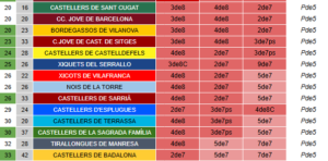 Els Castellers d’Esplugues han recuperat el 2de7 però han perdut el 4de8 descarregat, mentre que els Castellers de Terrassa han revalidat el 4de8 però han perdut el 3de8 i el 2de7. Els Castellers de la Sagrada Família han recuperat el 4de8. Els Tirallongues de Manresa han revalidat el 4de8 i els Castellers de Badalona, el 2de7.
